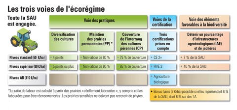 Pour l’écorégime, toute la surface agricole utile (SAU) est engagée, les terres arables, les prairies permanentes (PP) et les cultures permanentes (CP). Vous devez choisir entre les trois voies possibles : la voie des pratiques, celle de la certification ou celle de la biodiversité selon les critères résumés dans le tableau ci-dessous.